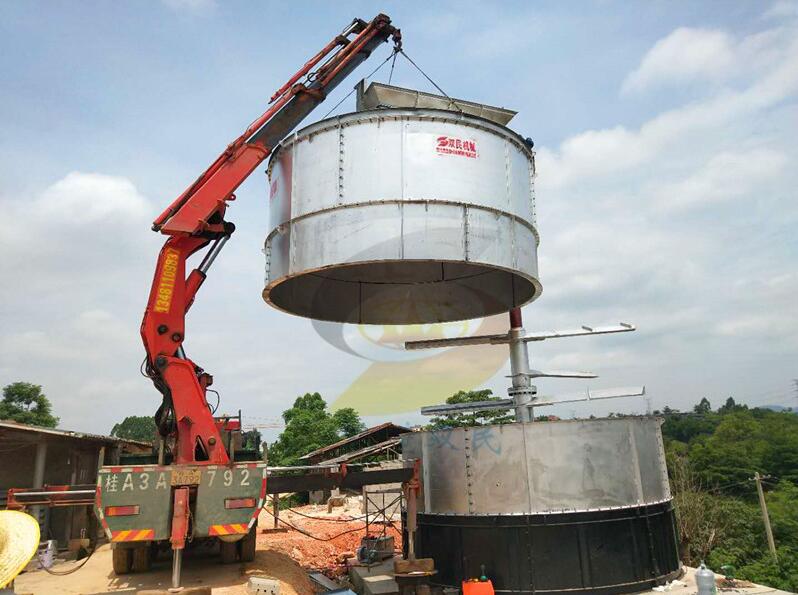 發酵罐主要由發酵室、液壓動力系統、主軸傳動系統、上料提升系統、自動高壓松風系統、出料系統、除理臭味系統和自動控制系統組成,工作時,先由上料提升系統將物料送到發酵室,開啟液壓動力系統,主軸開始轉動,實現物料攪拌,同時,開啟送風系統和輔助加熱系統,維持微生物發酵條件。等物料在微生物菌劑的作用下腐熟、降解穩定后,通過液壓動力系統開啟落料閥門,利用皮帶輸送機將發酵后的物料,發酵后排出的氣體通過系統收集處理達標后排除。