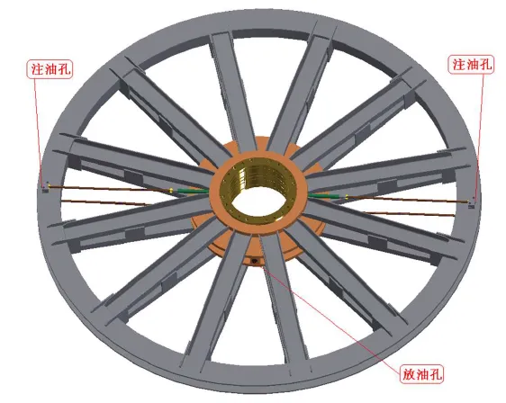 1.8 天(導向)輪軸瓦的維護 天(導向)輪生產完成后到到用戶安裝使用,一般會滯留一段時期,此時管路中及軸瓦內在制造廠所加的潤滑脂很可能已經變質失效、風干、附著在油管內壁和軸瓦油槽中,甚至形成堵塞,因此在使用前需要對潤滑管路及軸瓦進行清洗,保證潤滑油路的暢通。清洗時,將煤油等清洗劑通過輪緣上注油孔注入,游動輪輪轂中部設有2-M33×2出油口(此口也可以做注油口使用),清洗完成后用螺塞堵住。