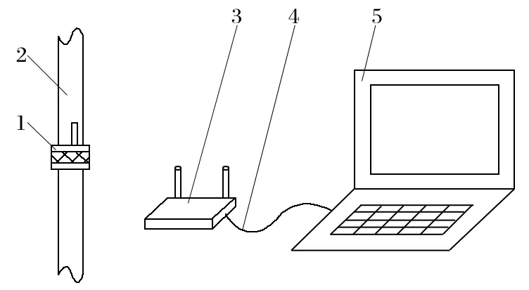 1.無線測量儀;2.罐道鋼絲繩;3.無線接收模塊;4.通信電纜;5.電腦。