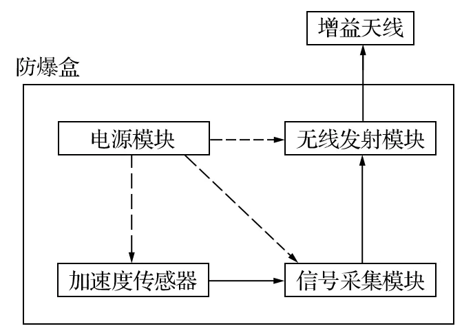 基于振動波周期法研制的礦用罐道繩張力檢測裝置如圖3 所示。無線測量儀的原理框圖如圖4 所示。無線測量儀外部設有防爆外殼,將電源模塊、加速度傳感器、無線發射模塊、信號采集模塊等單元密封在內。