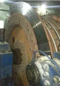現場觀察到,在制動盤上沿圓周分布有油污污染的痕跡,如圖2所示。拆掉在用的盤形制動器后,發現所有閘瓦磨損嚴重,且各個閘瓦磨損不均勻,甚至個別閘瓦已經斷裂,如圖3所示。還發現制動器內部聯接襯板筒體和活塞的大螺栓出現松動,碟形彈簧組中有個別碟簧斷裂,活塞處的密封圈也已經老化破損。