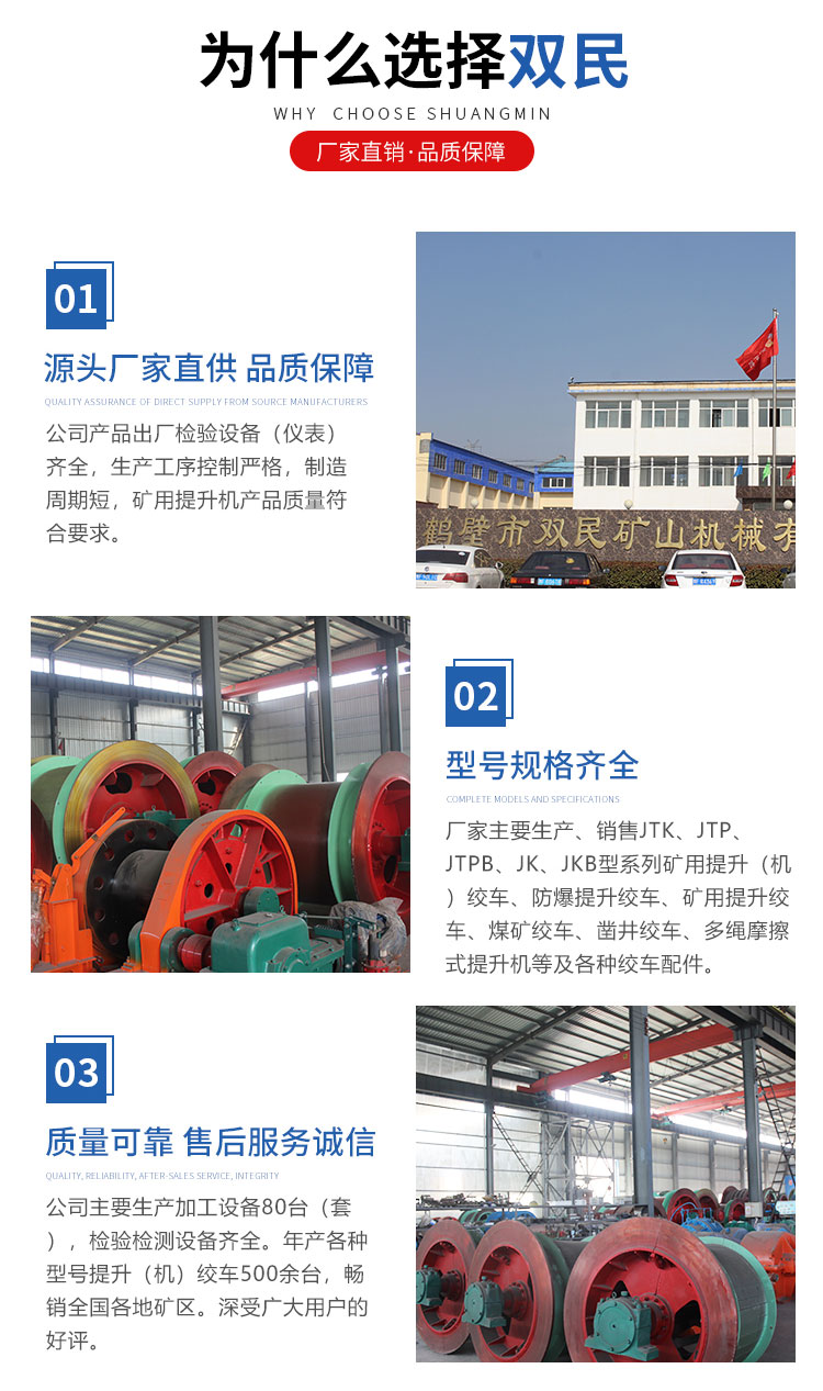 鶴壁市雙民礦山機(jī)械有限公司是以制造大型礦山提升設(shè)備,電器成套自動化控制系統(tǒng)為主的科研型高科技企業(yè),是國家礦山專用設(shè)備及配件產(chǎn)品定點生產(chǎn)單位。主要生產(chǎn)、銷售JTK、JTP、JTPB、JK、JKB、JKM、JKMD型系列礦用提升絞車、礦井提升機(jī)、多繩摩擦式提升機(jī)、JZ型